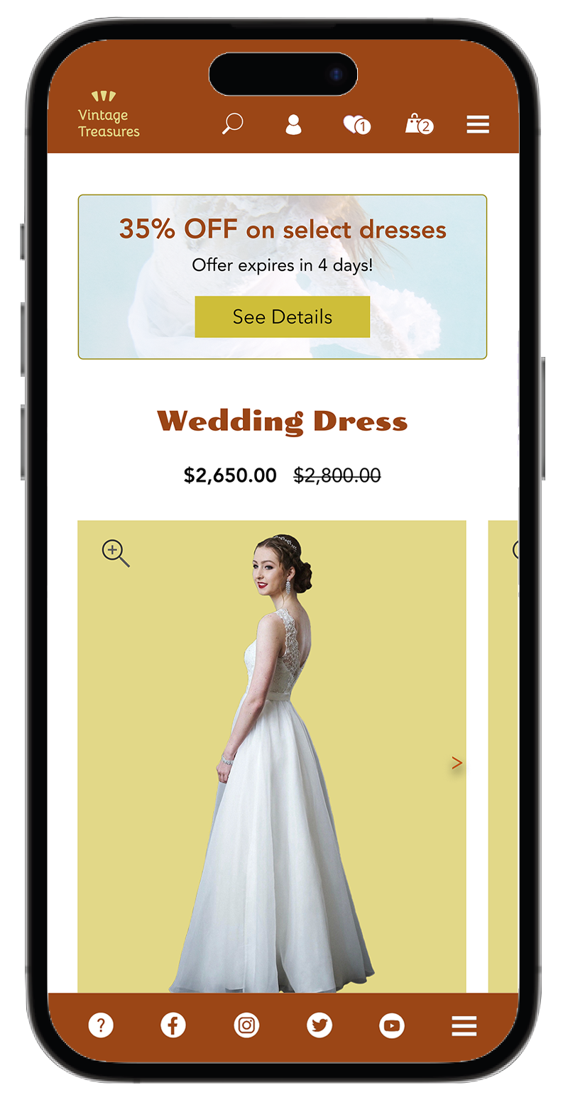 I chose a large Hero Image with a clear headline right at the top to make sure that users can immediately tell what the website is about. (The woman with a 60s-style haircut wearing a vintage dress carries a message of a nostalgia for old yet beautiful.) The buttons are also positioned at the very top to be seen without any unnecessary scrolling—I don’t want to lose anybody, not even the impatient users.
